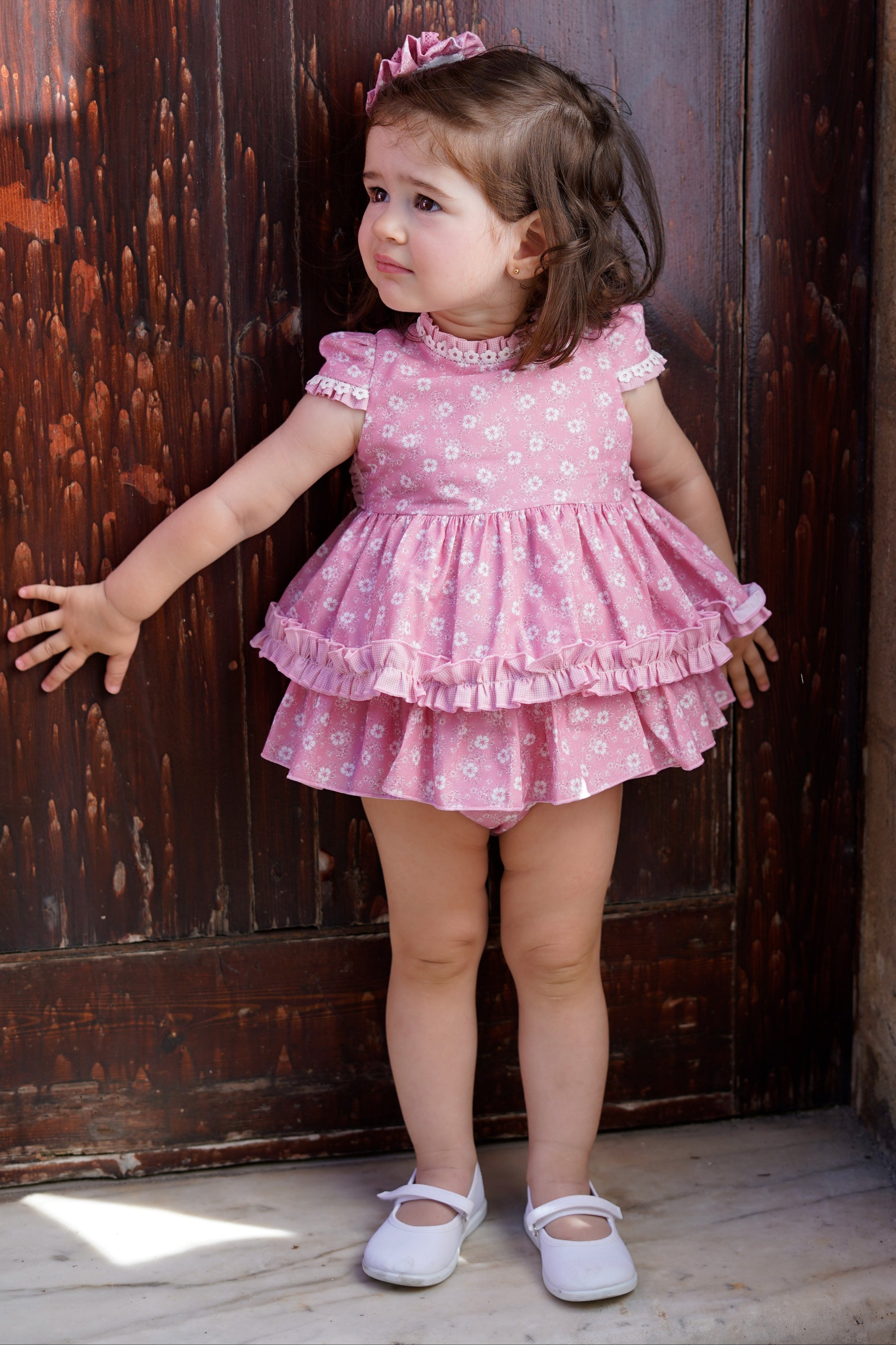 This elegant set includes a beautiful dress, matching hat and bloomers. The dress has an elegant design with delicate details and charming color choices.