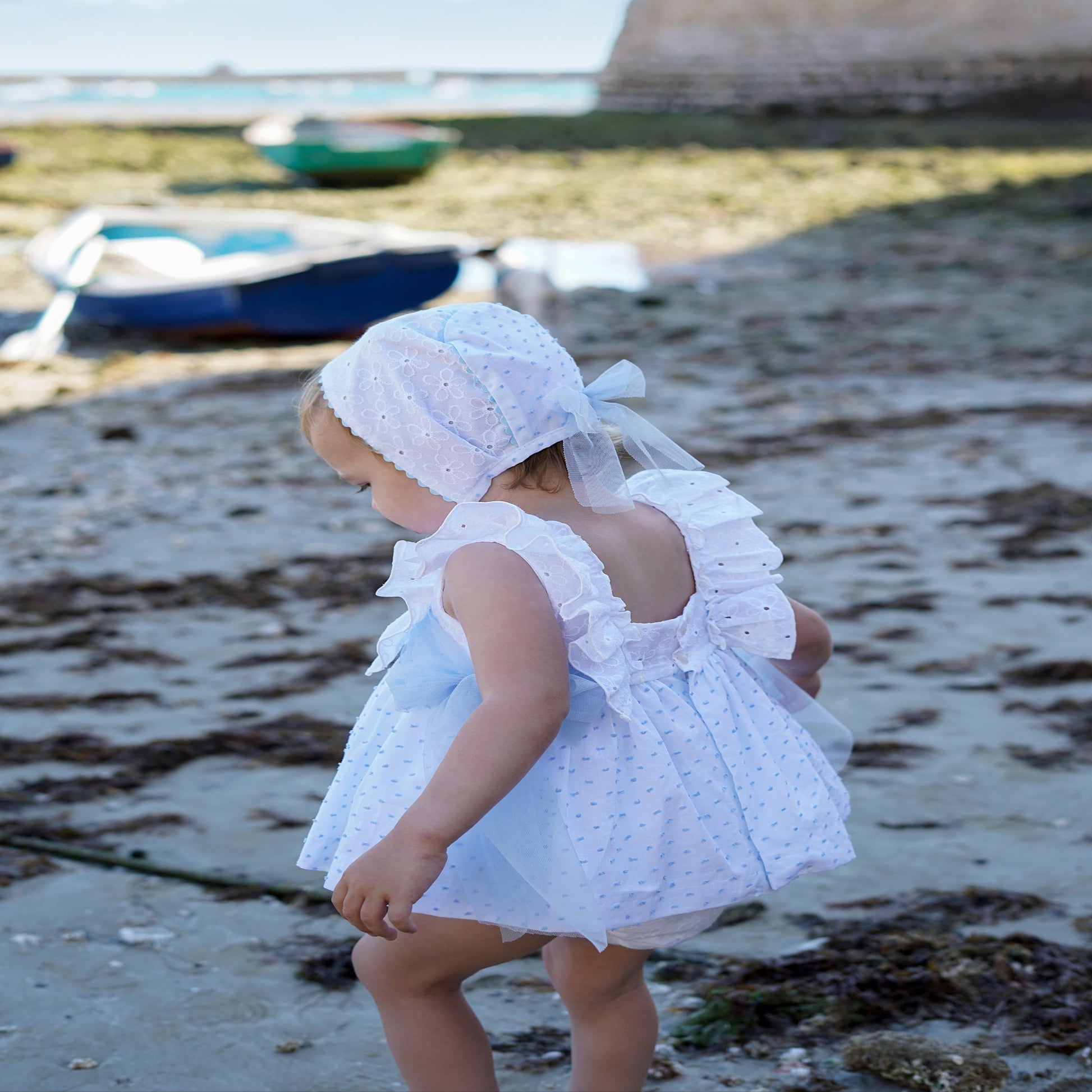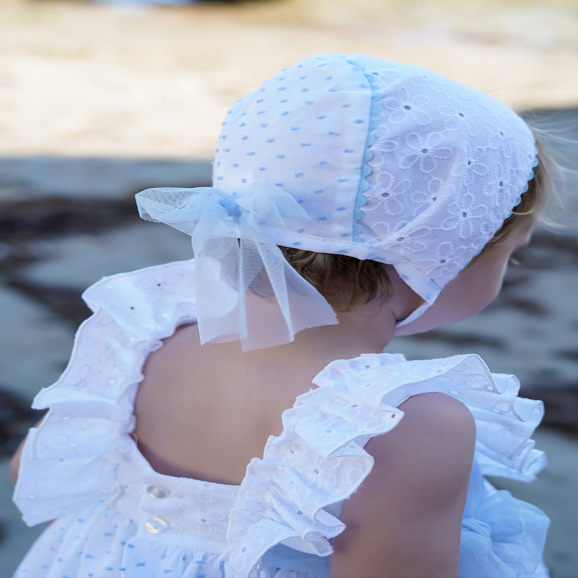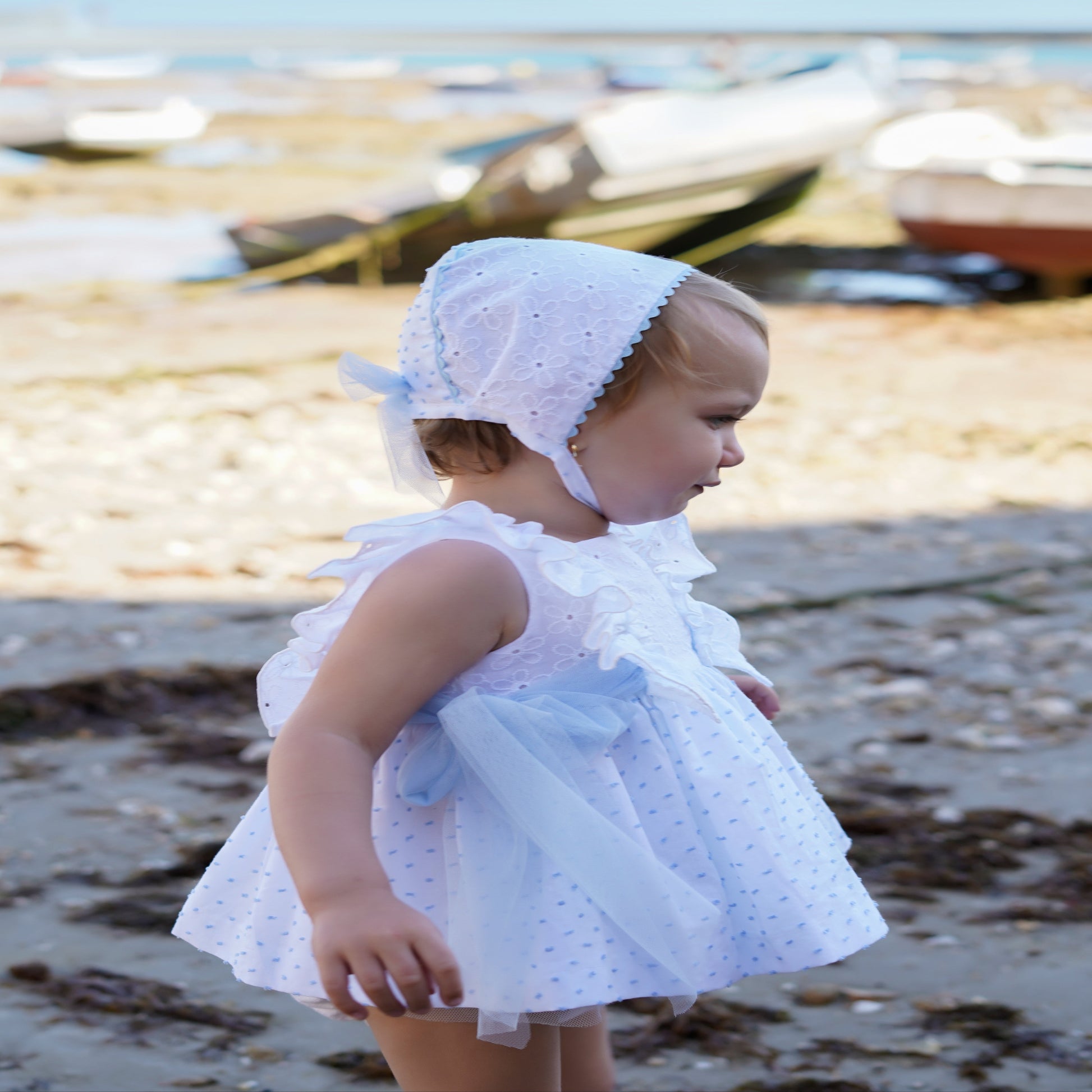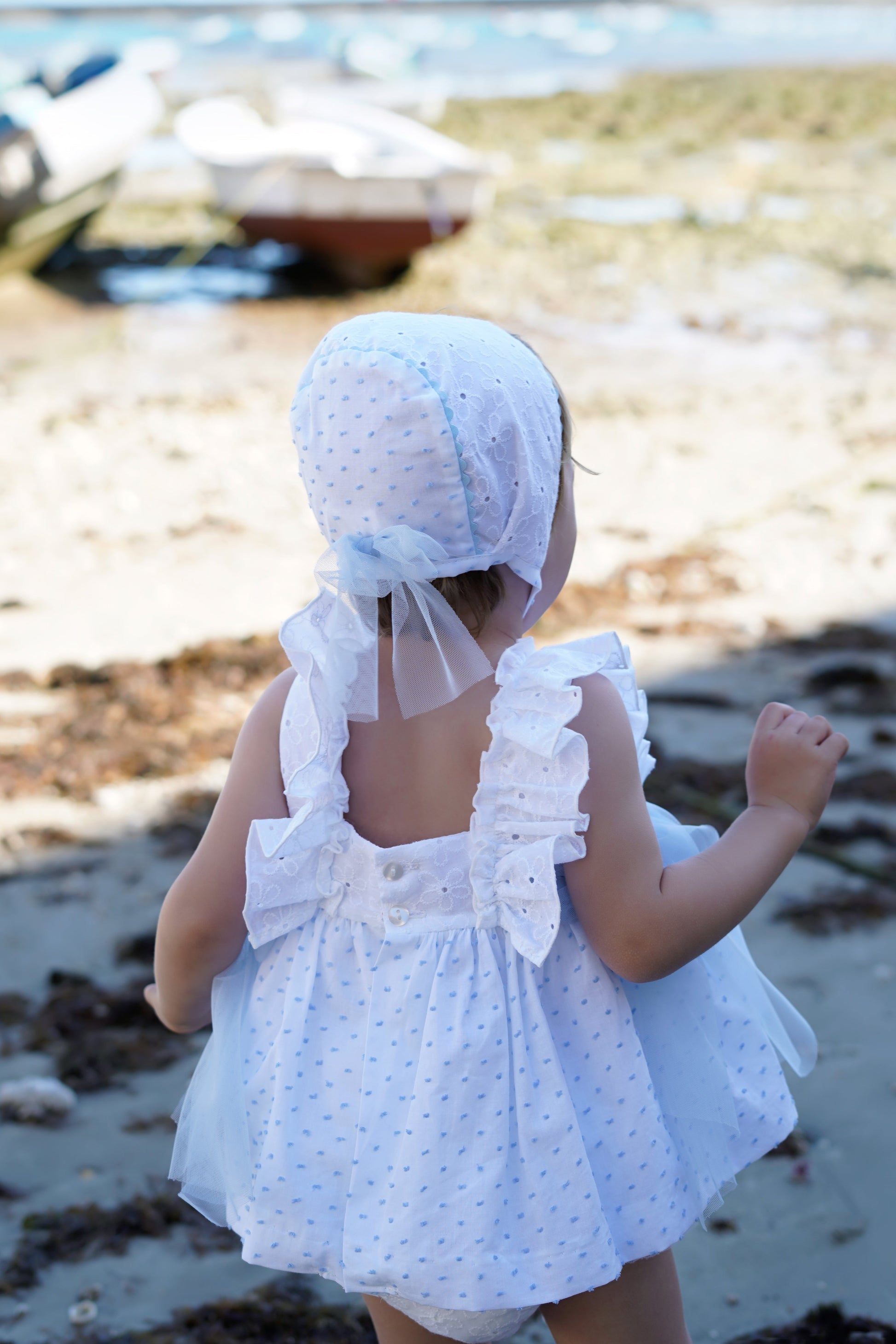 This elegant set includes a beautiful dress, matching hat and bloomers. The dress has an elegant design with delicate details and charming color choices.