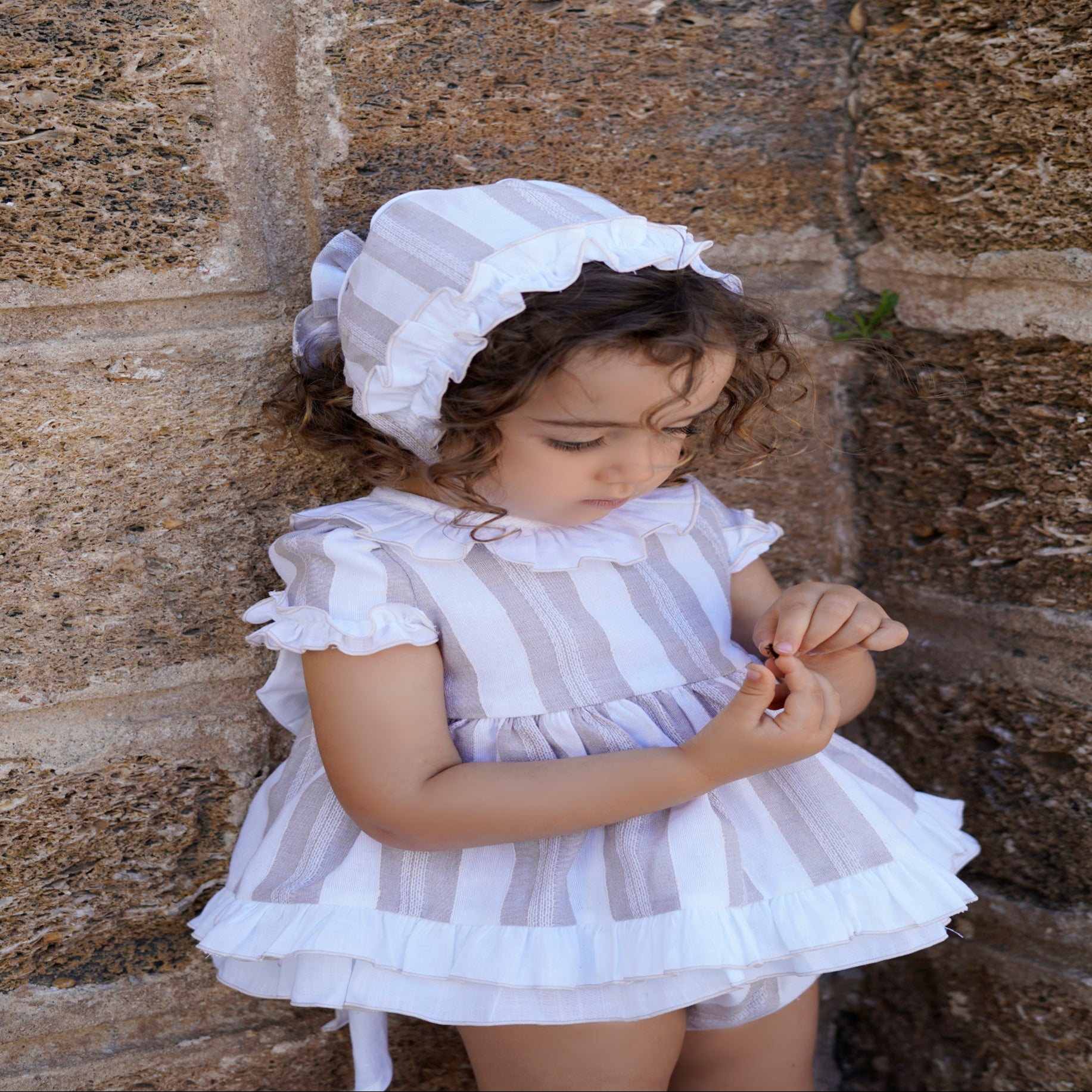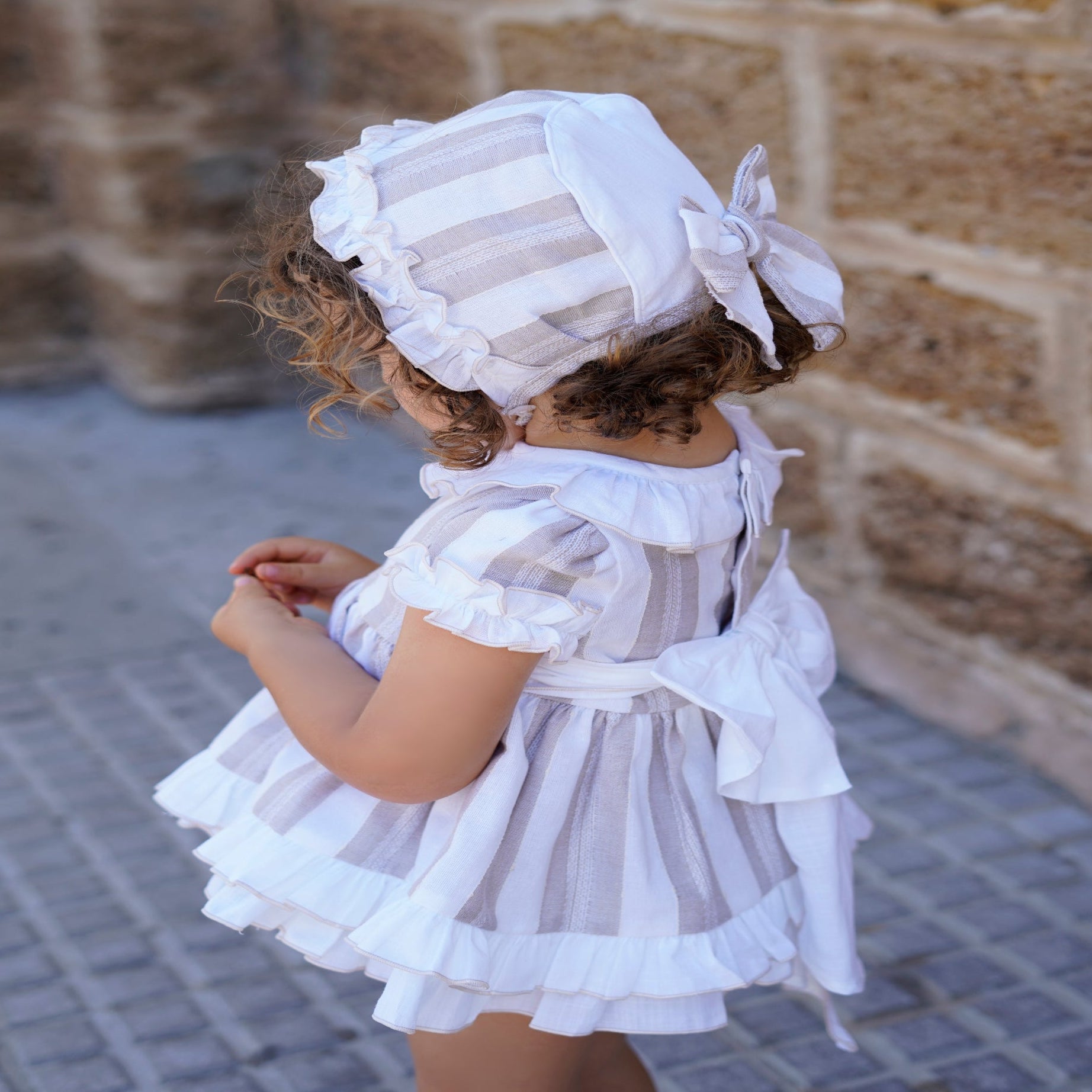 This elegant set includes a beautiful dress, matching hat and bloomers. The dress has an elegant design with delicate details and charming color choices.