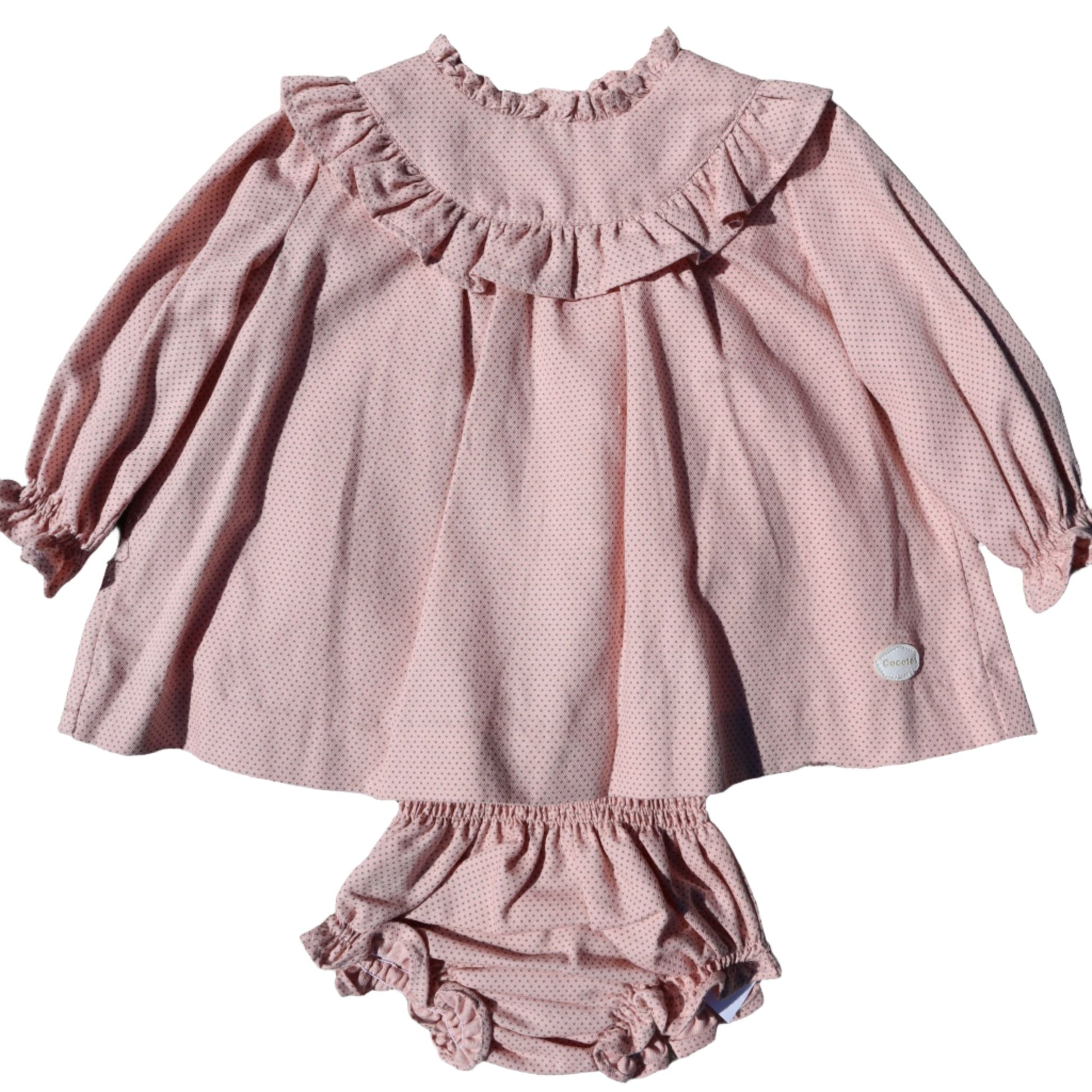 This adorable two-piece set is perfect for any occasion with its cute and stylish design. The set consists of a dress and bloomers in a peach color with gray polka dots that add a touch of playfulness, making it a must-have for any girl's wardrobe.