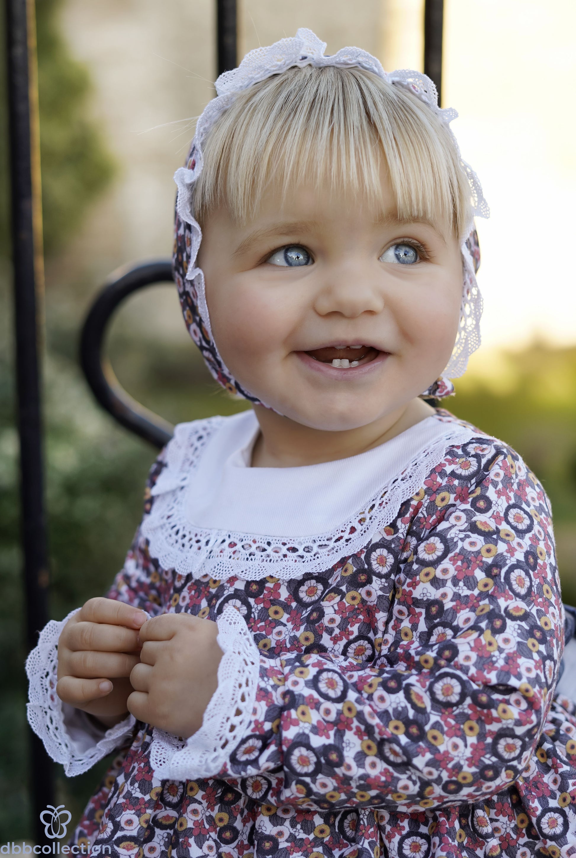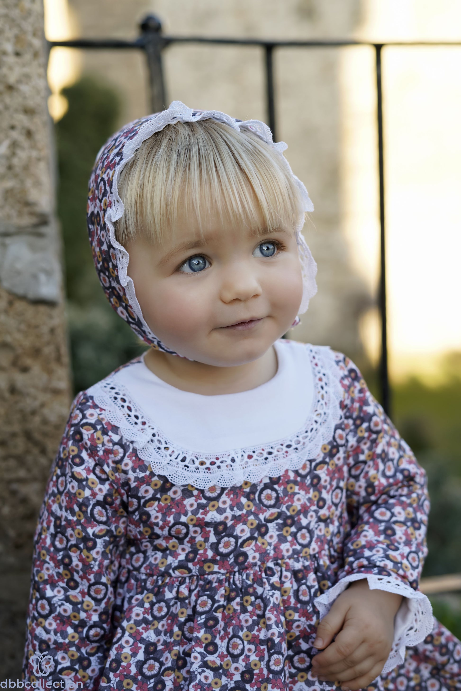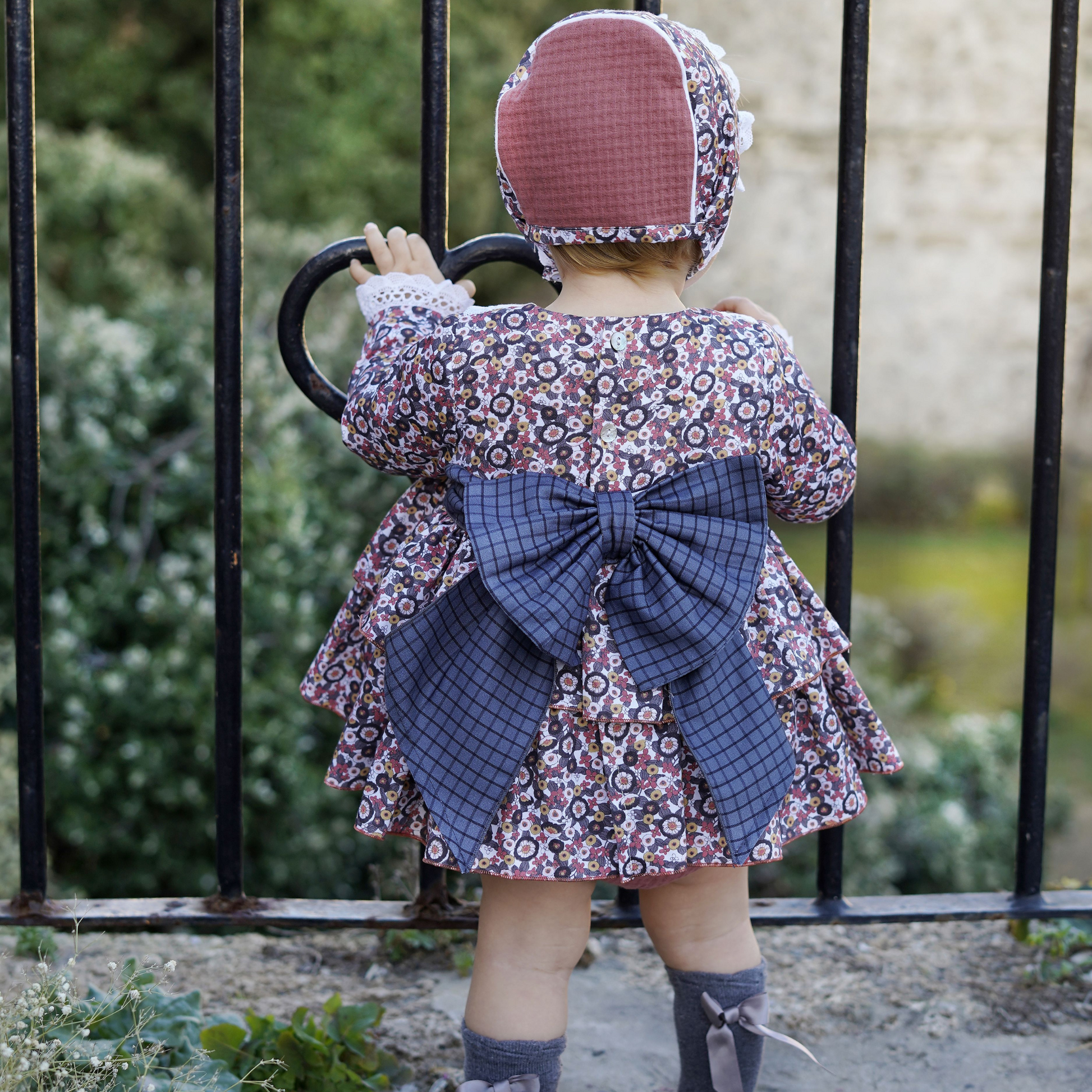 Dette elegante settet inneholder en vakker kjole, en matchende lue og bloomer. Kjolen har et elegant design med delikate detaljer og sjarmerende fargevalg.