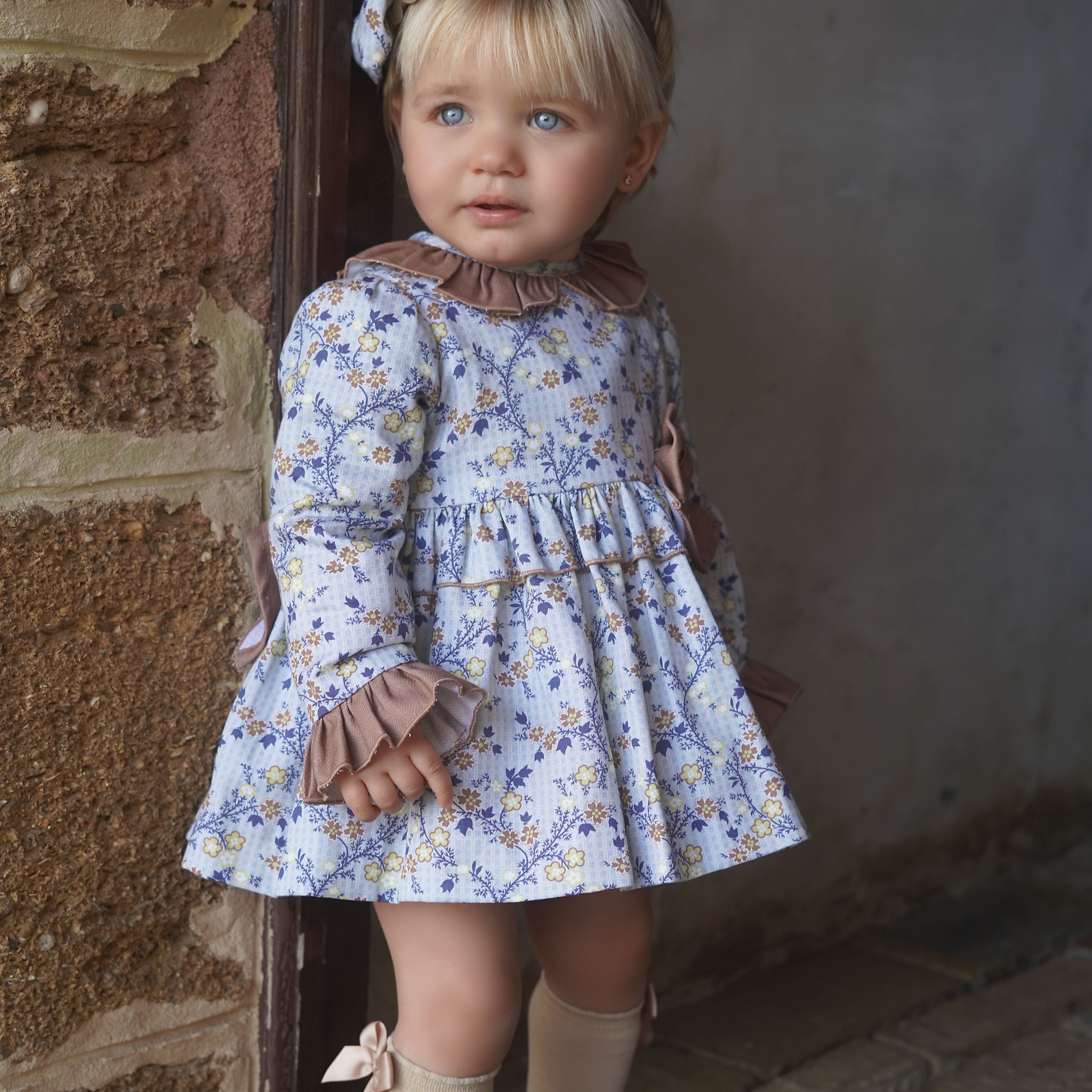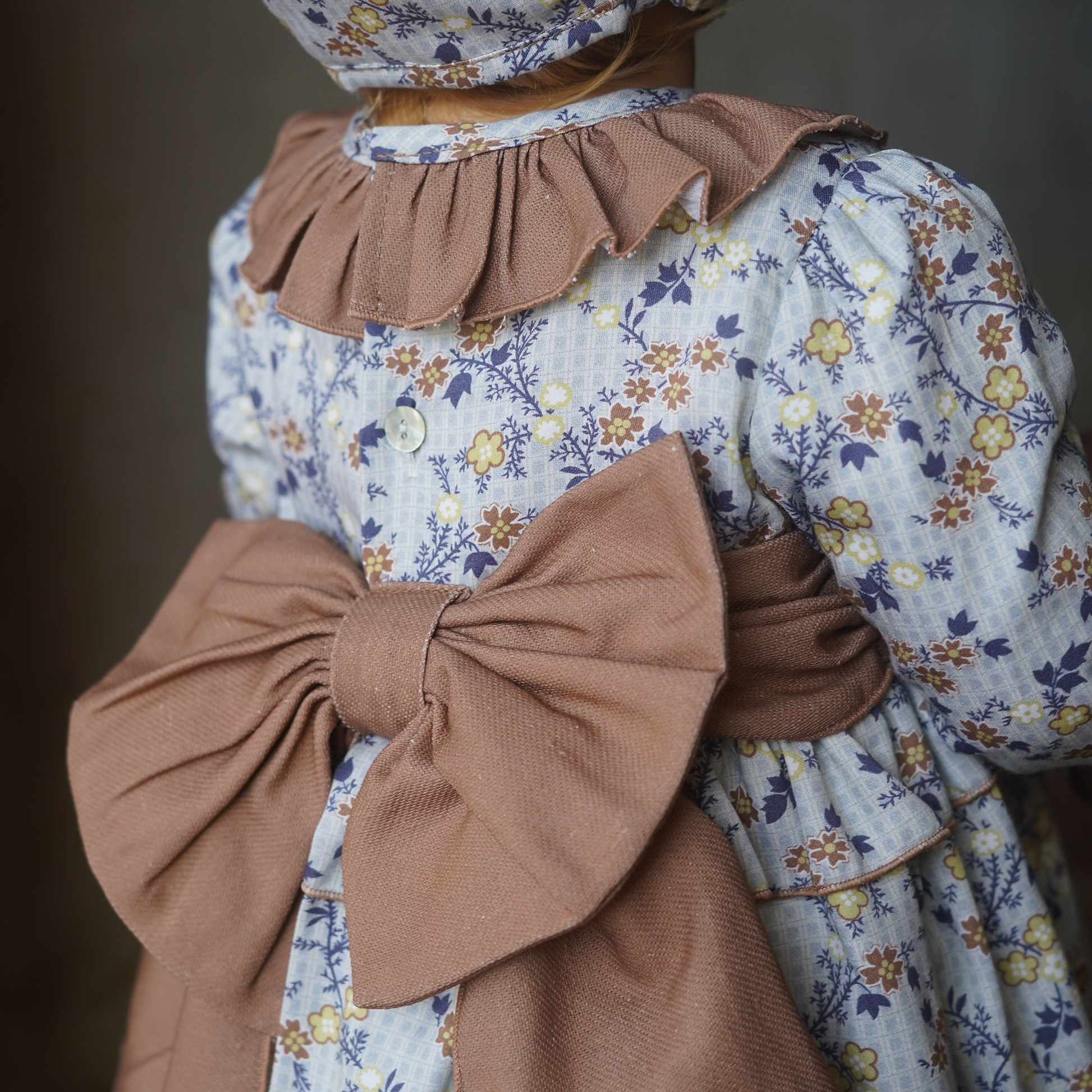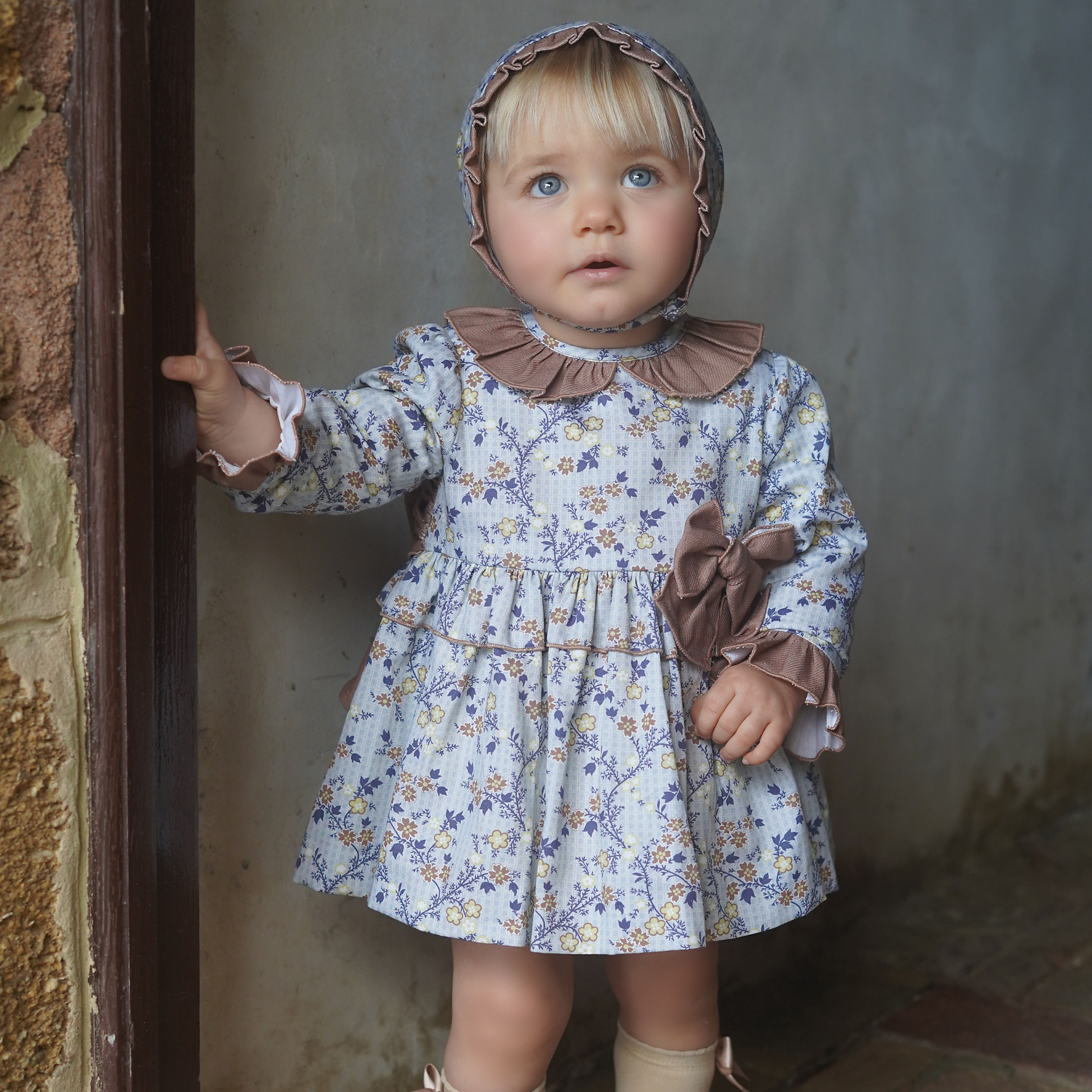 Dette elegante settet inneholder en vakker kjole, en matchende lue og bloomer. Kjolen har et elegant design med delikate detaljer og sjarmerende duse fargevalg.