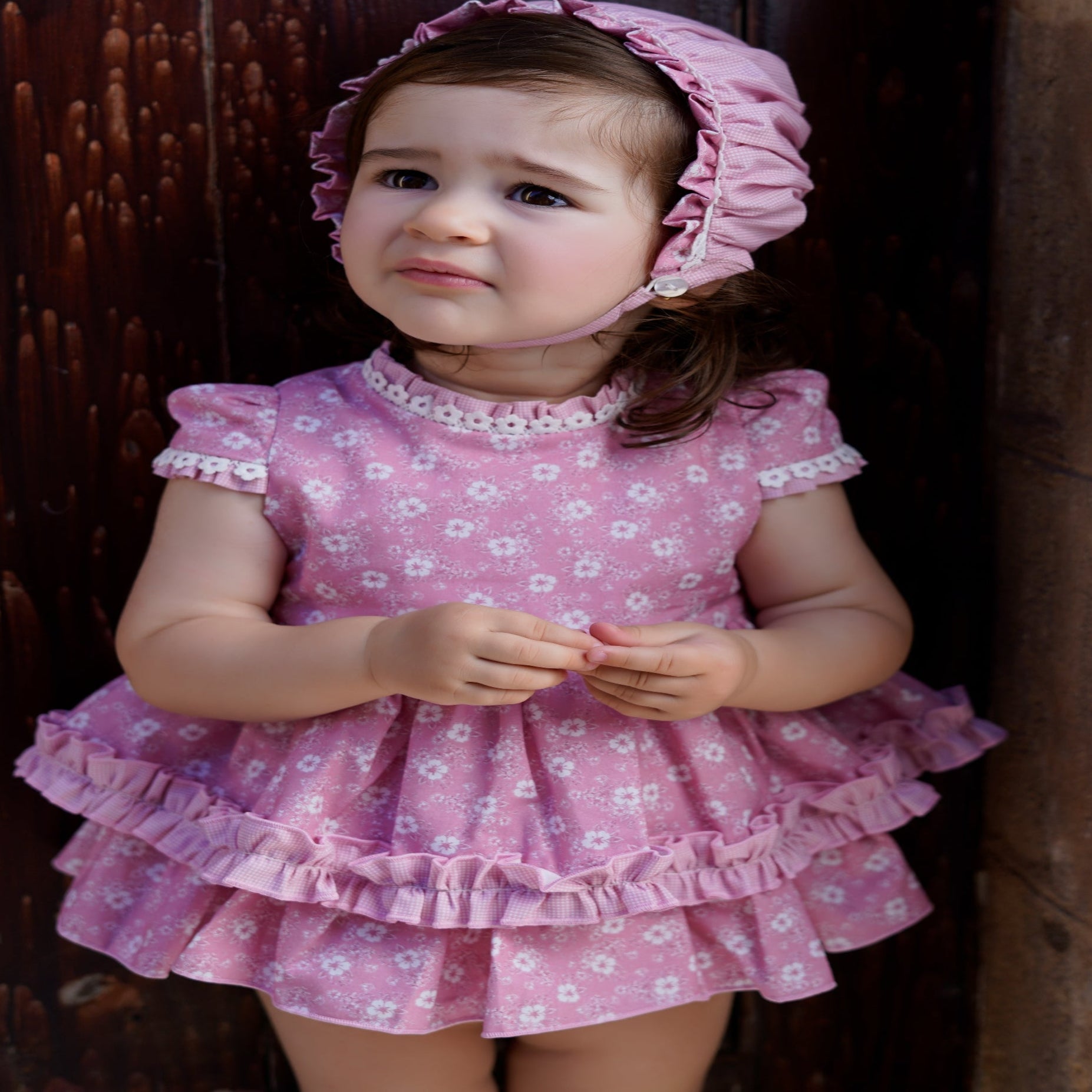 Dette elegante settet inneholder en vakker kjole, en matchende lue og bloomer. Kjolen har et elegant design med delikate detaljer og sjarmerende fargevalg.