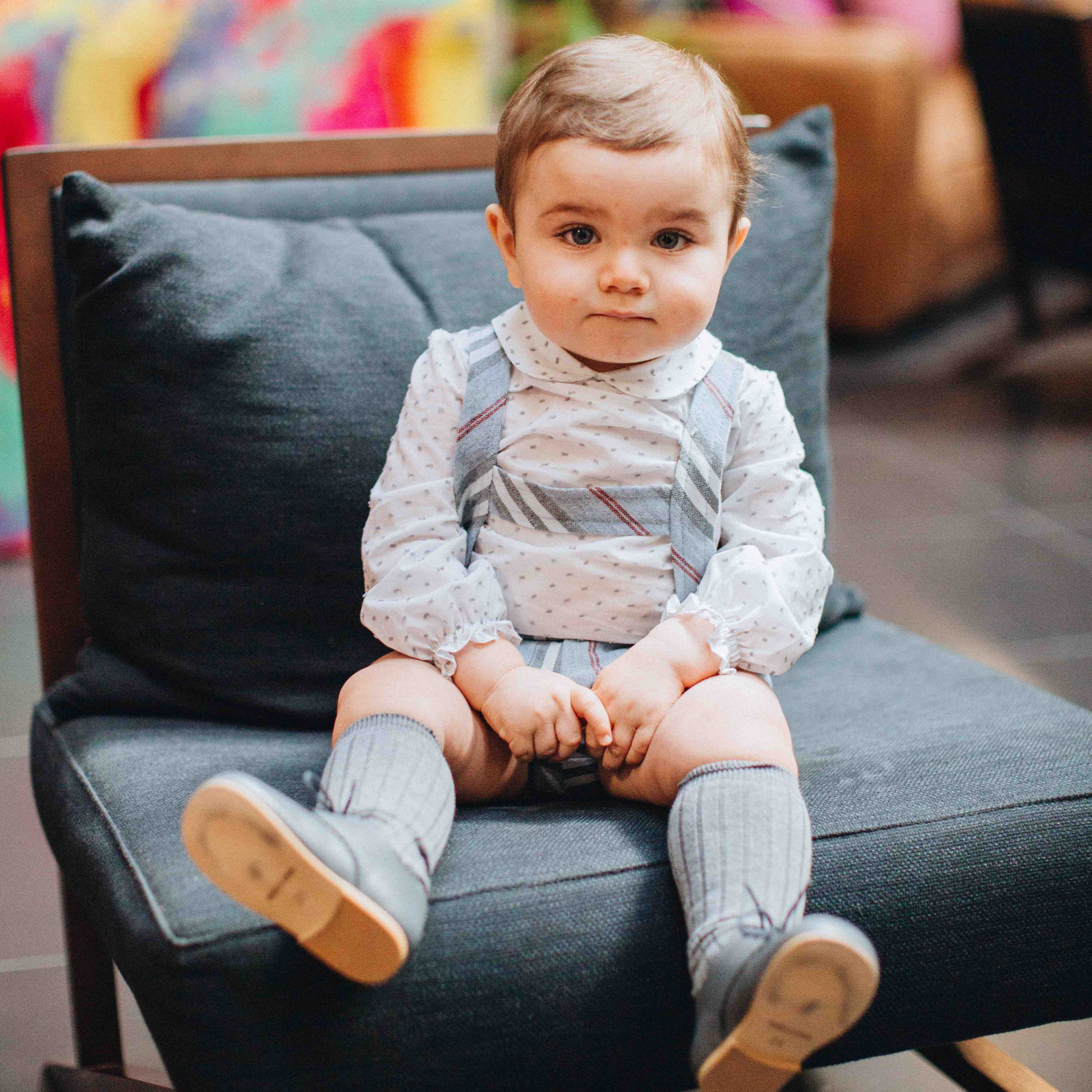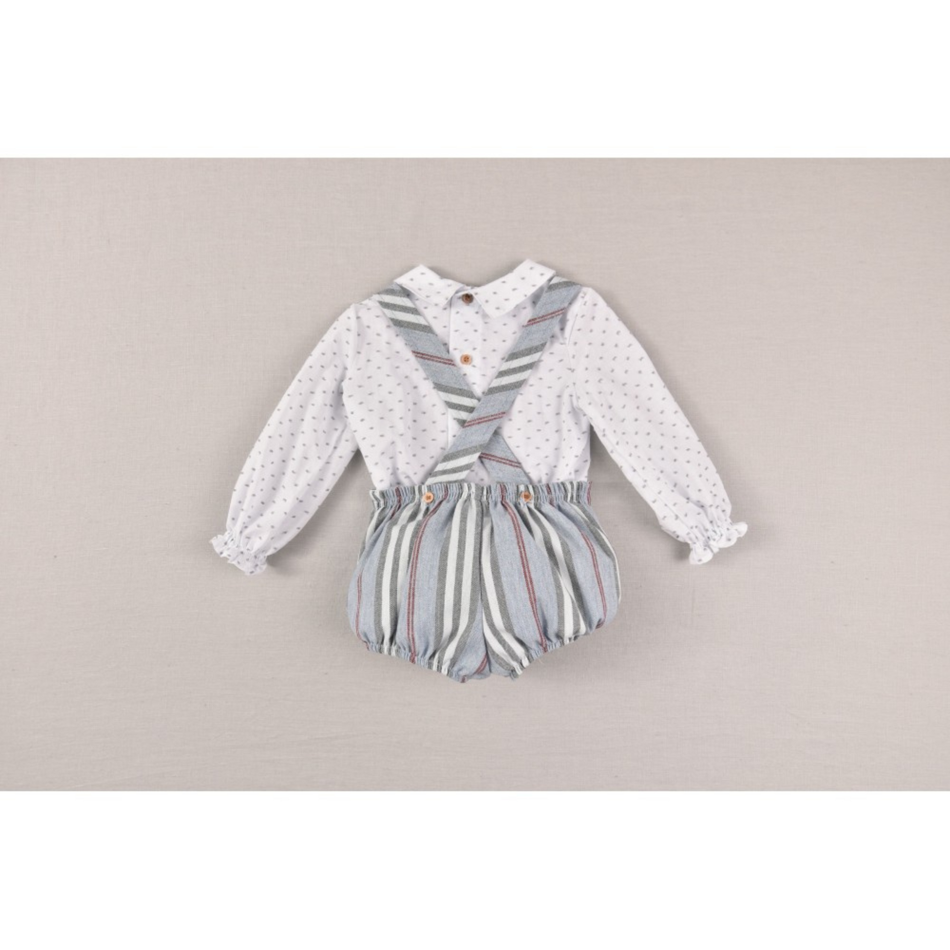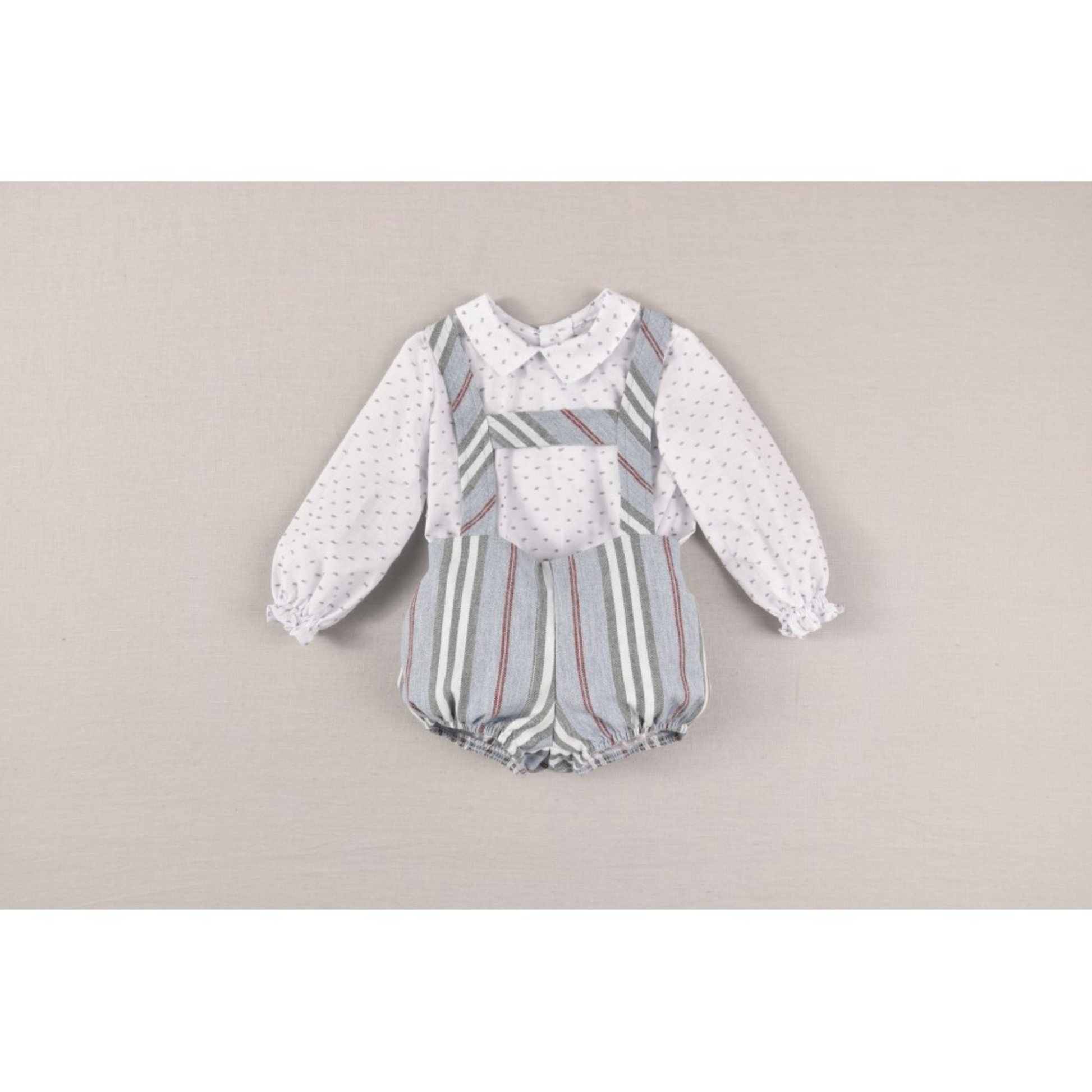 Kle den lille med stil med vårt bedårende todelte settet for babygutt, bestående av en selebukse og skjorte. Selebuksen har et lekent og flott stripete design, og skjorten med vakkert prikkete design.