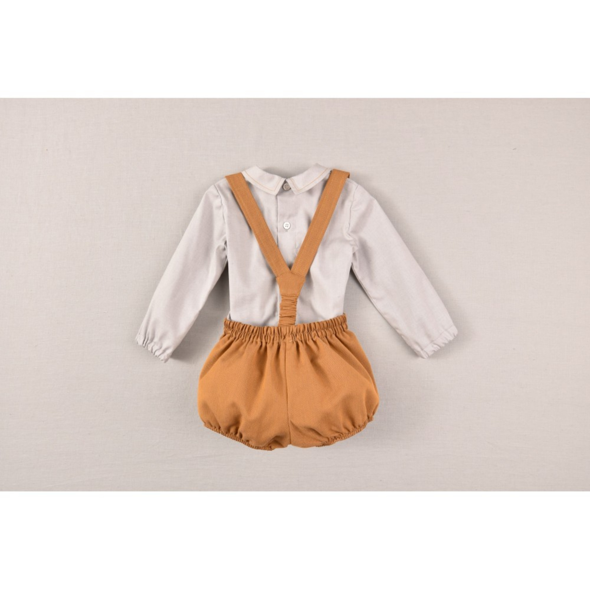 Dette stilige og allsidige antrekket inkluderer et par komfortable og trendy selebukse og en klassisk button-down-skjorte. Dette anrekket er perfekt for å kle opp den lille til spesielle begivenheter eller til hverdagsbruk.